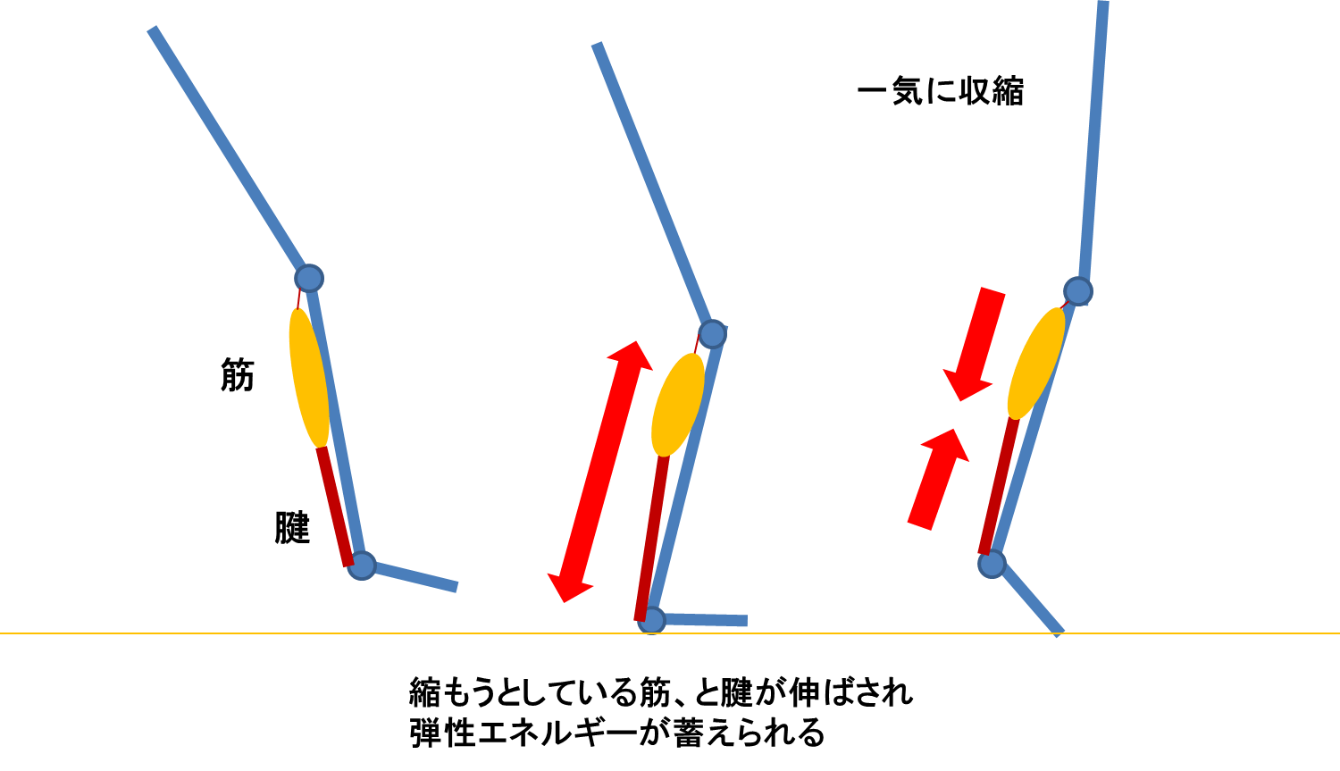 この時、筋肉はあまり引き伸ばされず、アイソメトリック収縮のような状態になり、無駄なエネルギー消費なく、腱に大きな弾性エネルギーを蓄えさせます。
