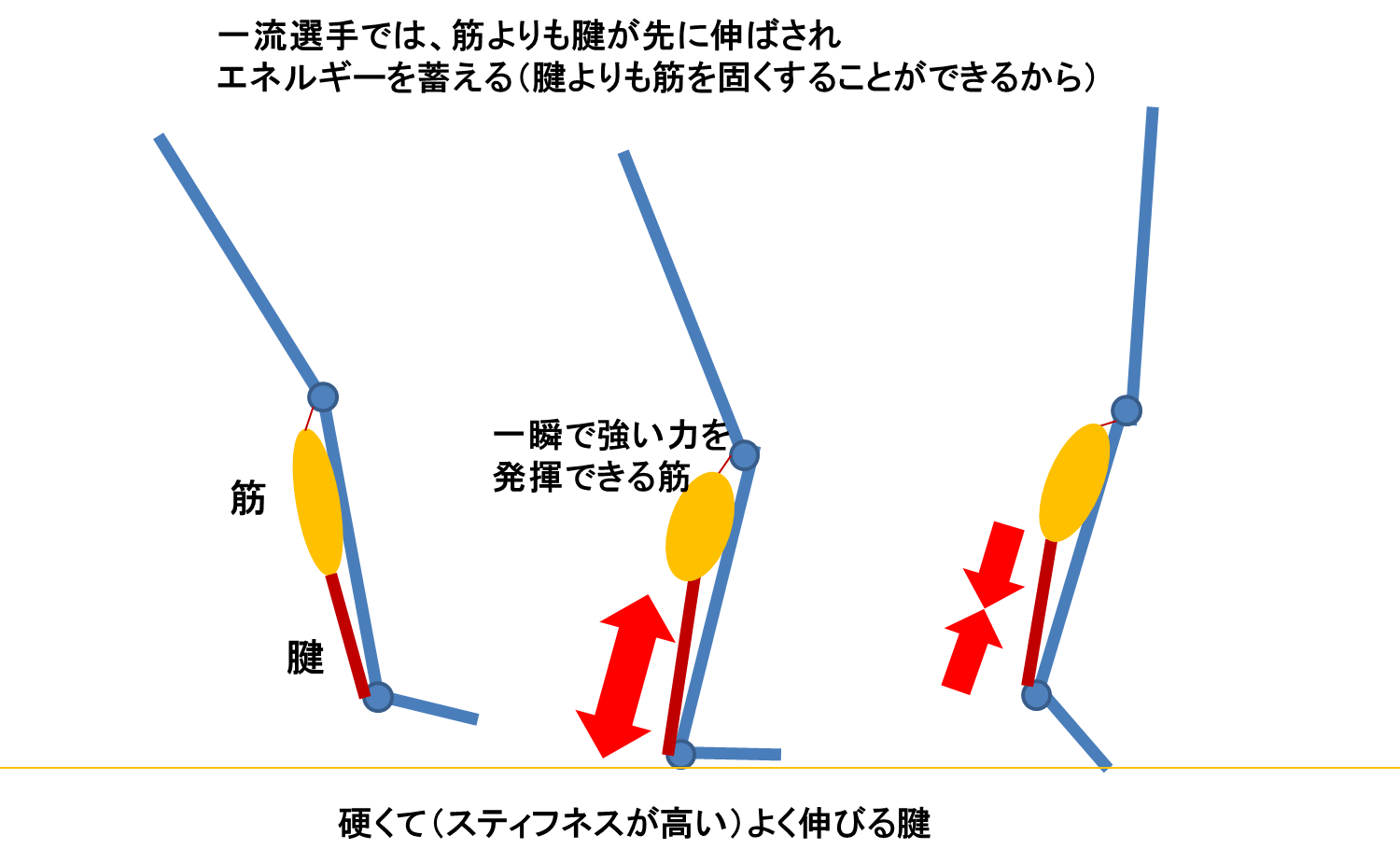 そして、一流選手では弾性エネルギーが、筋肉よりも先に腱に蓄えられます。